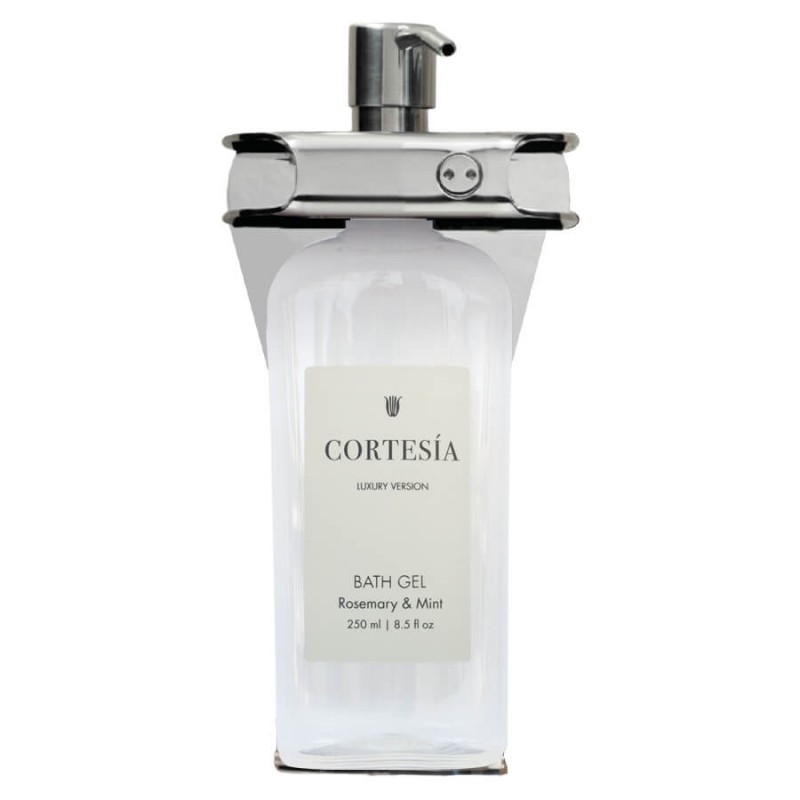 As dispensadores da linha CORTESÍA são vendidas vazias e foram projetadas para serem recarregadas, oferecendo uma opção mais sustentável. O produto para recarga possui uma fragrância fresca e revitalizante, resultante da mistura de Aloe Vera, Alecrim e Menta. Elas são transparentes, permitindo ver facilmente o produto restante, e possuem um rótulo em dois idiomas, garantindo fácil identificação do conteúdo.