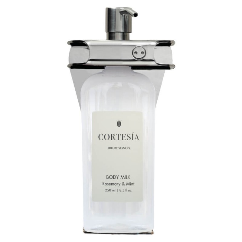 As dispensadores da linha CORTESÍA são vendidas vazias e foram projetadas para serem recarregadas, oferecendo uma opção mais sustentável. O produto para recarga possui uma fragrância fresca e revitalizante, resultante da mistura de Aloe Vera, Alecrim e Menta. Elas são transparentes, permitindo ver facilmente o produto restante, e possuem um rótulo em dois idiomas, garantindo fácil identificação do conteúdo.