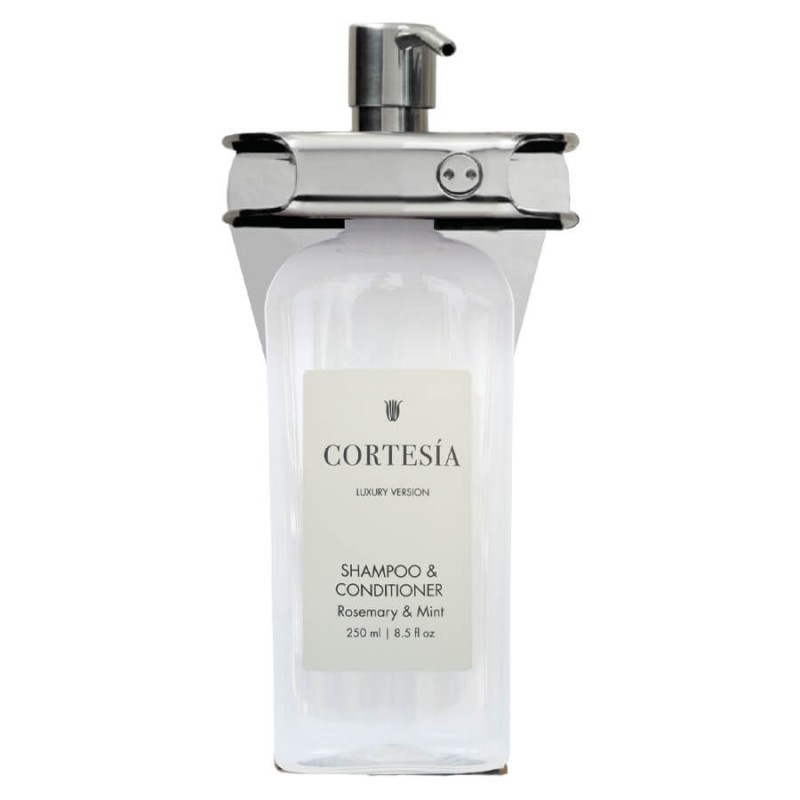 As garrafas da linha CORTESÍA são vendidas vazias e foram projetadas para serem recarregadas, oferecendo uma opção mais sustentável. O produto para recarga possui uma fragrância fresca e revitalizante, resultante da mistura de Aloe Vera, Alecrim e Menta. Elas são transparentes, permitindo ver facilmente o produto restante, e possuem um rótulo em dois idiomas, garantindo fácil identificação do conteúdo.